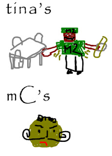 was chatting with Tina darling the other day on MSN. We were catching up on stuff and life and i have no idea how we ended up in a doodle competition. Tina suggest that we take turns to name a random object, and we both draw it. the best picture wins.
